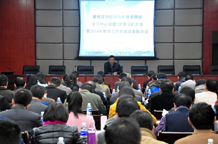 1月15日上午,我校在四楼新会议室召开2015年党委理论学习中心组第一次学习扩大会暨2014年教学工作总结及表彰大会。大会主题是“加强内涵建设、深化教学改革、明确学校定位、突出办学特色”。副校长刘立新主持会议。